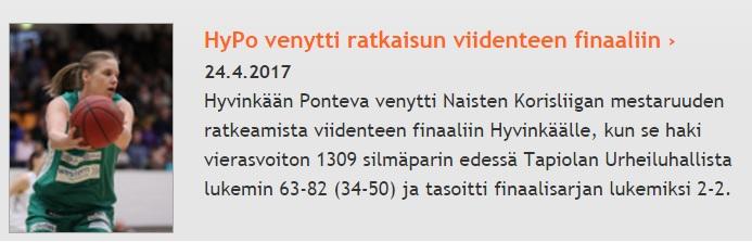 Taru Tuukkasen huippupeli siivitti HyPon historialliseen voittoon! Torstaina Martissa Grande Finale! Ponteva voitti Espoon myös vieraissa!Taru Tuukkasen huippupeli siivitti HyPon historialliseen…