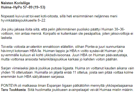 Huima – Ponteva 57 : 89 (8 – 26, 11 – 27, 18 – 14, 20 – 22)